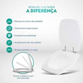 Durabilidade e Resistência: Fabricado em resina maciça de poliéster, este assento sanitário é altamente resistente e totalmente impermeável.