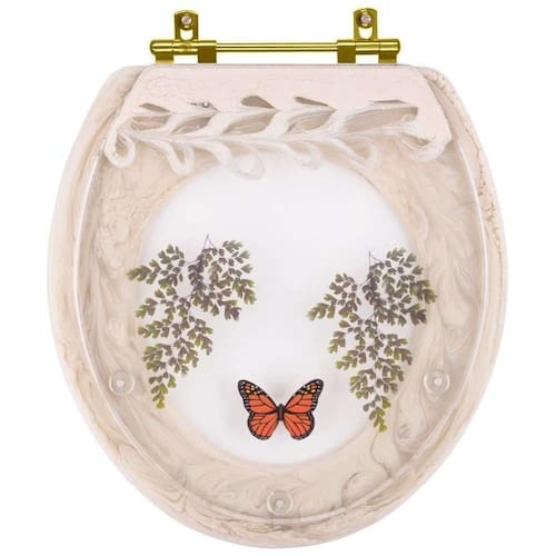 Assento Sanitário Poliester Decorado Oval Convencional Biscuit Avenca com Borboleta Vermelha Com Ferragem Dourada