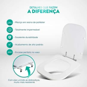 Durabilidade e Resistência: Fabricado em resina maciça de poliéster, este assento sanitário é altamente resistente e totalmente impermeável.