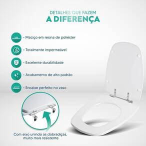 Limpeza: recomenda-se a limpeza do assento sanitário poliéster com água e sabão neutro, não utilizar produtos abrasivos.