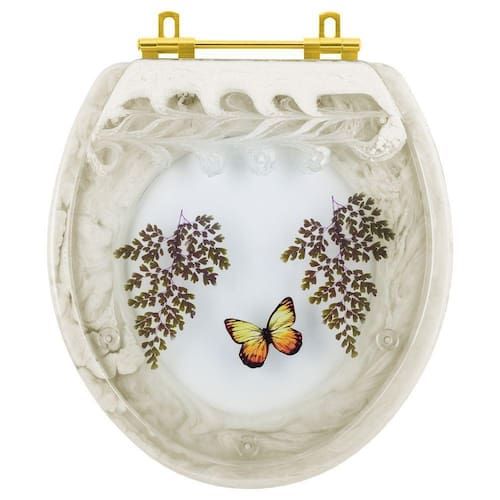 Assento Sanitário Poliéster Oval Bege Decorado Borboleta Amarela Com Ferragem Dourada