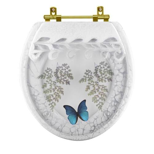 Assento Sanitário Poliester Oval Branco Decorado Borboleta Azul Com Ferragem Dourada O Assento Sanitário Poliester Oval Branco Decorado Borboleta Azul Com Ferragem Dourada é a opção ideal para quem busca combinar funcionalidade com elegância em seu banheiro. Elegância e Diferenciação: Um design refinado e diferenciais de alto padrão. Com acabamento de excelência e ferragens em alumínio anodizado na cor Dourada que não oxidam nem enferrujam, ele é a combinação perfeita de beleza e durabilidade.
