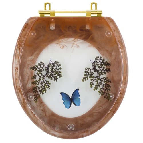 O Assento Sanitário Poliester Oval Caramelo Decorado Borboleta Azul Com Ferragem Dourada é a opção ideal para quem busca combinar funcionalidade com elegância em seu banheiro.