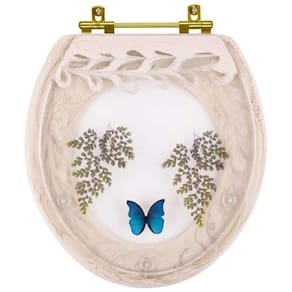 Assento Sanitário Poliester Oval Creme Decorado Borboleta Azul Com Ferragem Dourada