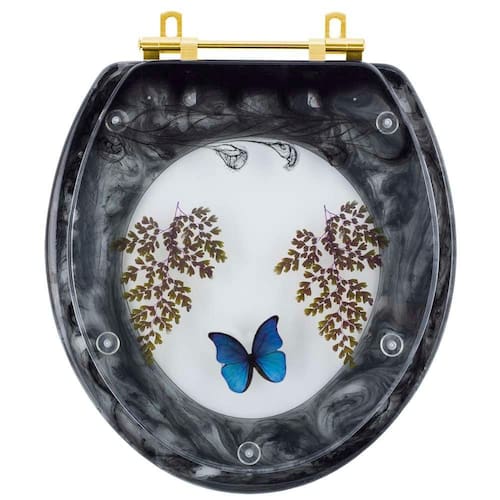 O Assento Sanitário Poliester Oval Preto Decorado Borboleta Azul Com Ferragem Dourada é a opção ideal para quem busca combinar funcionalidade com elegância em seu banheiro.