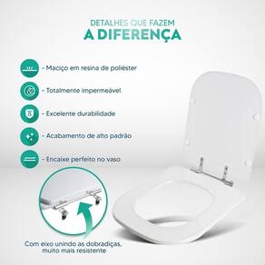Durabilidade e Resistência: Fabricado em resina maciça de poliéster, este assento sanitário é altamente resistente e totalmente impermeável.