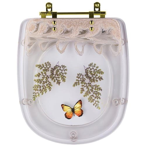 Assento Sanitário Poliéster Sabatini Decorado Borboleta Amarela Com Ferragem Dourada - Branco