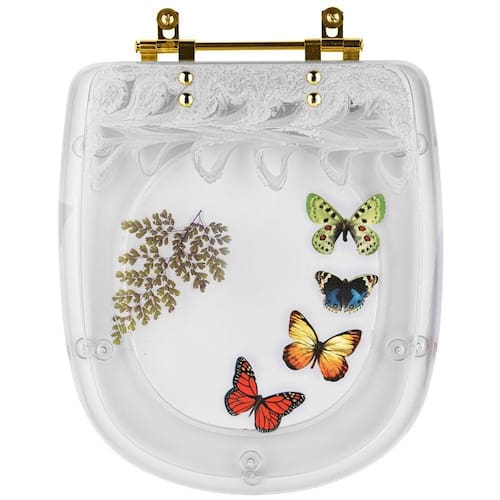 Assento Sanitário Poliéster Sabatini Decorado Borboletas Com Ferragem Dourada - Branco