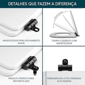 O sistema soft close é composto por dois amortecedores, um para a tampa e outro para o assento. Estes amortecedores ficam dentro das ferragens do produto (não ficam aparentes). Eles fazem com que a tampa e o assento desçam lentamente, então caso uma pessoa solte a tampa do assento sanitário, ela irá descer lentamente, sem bater.