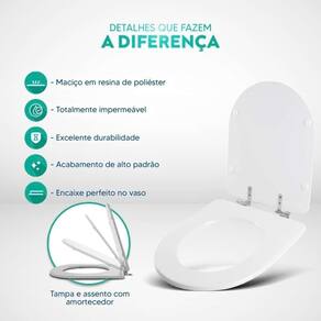 Durabilidade e Resistência: Fabricado em resina maciça de poliéster, este assento sanitário é altamente resistente e totalmente impermeável.