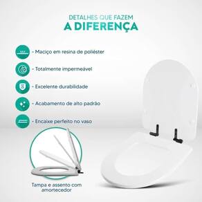 Durabilidade e Resistência: Fabricado em resina maciça de poliéster, este assento sanitário é altamente resistente e totalmente impermeável.