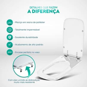 Limpeza: recomenda-se a limpeza do assento sanitário poliéster com água e sabão neutro, não utilizar produtos abrasivos.
