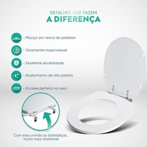 Durabilidade e Resistência: Fabricado em resina maciça de poliéster, este assento sanitário é altamente resistente e totalmente impermeável.
