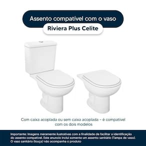 Este assento sanitário é compatível para uso em vaso sanitário Celite modelo Riviera Plus com ou sem caixa acoplada (é compatível com os dois tipos de vasos).