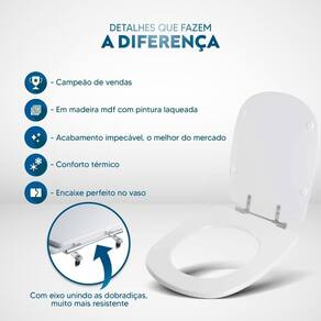 Durabilidade e Resistência: Fabricado em MDF com camadas de pintura laqueada, este assento oferece não apenas beleza, mas também conforto térmico e alta resistência. Seu acabamento impecável adiciona um toque de classe ao seu banheiro.