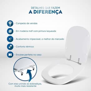 Durabilidade e Resistência: Fabricado em MDF com camadas de pintura laqueada, este assento oferece não apenas beleza, mas também conforto térmico e alta resistência. Seu acabamento impecável adiciona um toque de classe ao seu banheiro.