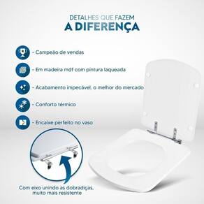 Durabilidade e Resistência: Fabricado em MDF com camadas de pintura laqueada, este assento oferece não apenas beleza, mas também conforto térmico e alta resistência. Seu acabamento impecável adiciona um toque de classe ao seu banheiro.
