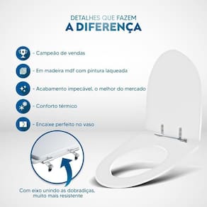 Itens inclusos: assento e tampa em madeira MDF com pintura laqueada. Ferragens metálicas em alumínio anodizado muito resistente, não oxidam e não enferrujam.