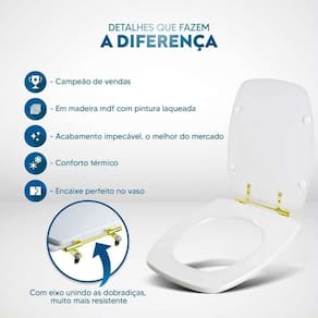 Durabilidade e Resistência: Fabricado em MDF com camadas de pintura laqueada, este assento oferece não apenas beleza, mas também conforto térmico e alta resistência. Seu acabamento impecável adiciona um toque de classe ao seu banheiro.