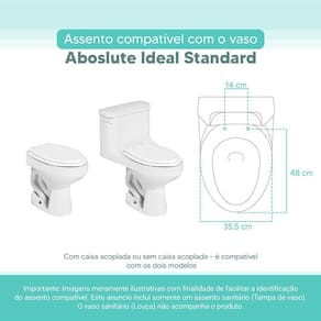 OBS.: O código 6LPF gravado na louça sanitária corresponde ao fluxo de água de uma descarga e não indica o modelo da mesma. RBN: Casa/Banho/Instalações e Acessórios de Banheiro/Vasos Sanitários e Peças/Assento de Vaso Sanitário | Conteúdo da Embalagem: 01 Assento Sanitário | Tipo: Assento Sanitário | Produto: Assento Sanitário | Site do Fabricante: | Marca do Assento Sanitário: Pontto Lavabo | : 6 meses contra defeitos de fabricação | Dica: Instalação: sem desmontar o produto, posicione sobre o vaso sanitário e encaixe os dois parafusos com as borrachas pretas dentro do furo do vaso. Aperte com a chave de fenda no sentido horário até ficar firme. | Para Vaso Sanitário do Modelo: Absolute | Para vaso Sanitário da Marca: Ideal Standard | Cor: Branco | Tonalidade: Branco | Material do Assento Sanitário: MDF Laqueado | Instruções de Limpeza: Recomenda-se a limpeza com pano úmido e sabão neutro, não utilizar produtos abrasivos ou químicos | Almofadado?: Não | Peso do Produto: | Tipo de Fechamento: Fechamento Comum | Material da Fixação: Alumínio Anodizado | Precisa de baterias ou pilhas: Não | Regulamentações aplicáveis a produtos perigosos: Não aplicável | Código de certificação: Não aplicável | Ponto de Destaque01: Produzido em MDF Laqueado | Ponto de Destaque02: Ferragem em Alumínio Anodizado (não enferruja, não oxida) | Ponto de Destaque03: Possui 14cm de distância entre furos | Ponto de Destaque04: Produto vai completo, fácil instalação | Ponto de Destaque05: Pontto Lavabo | Termos de Pesquisa01: Assento Sanitário; Tampa de Vaso Sanitário; Absolute Branco Ideal Standard; Absolute 6lpf; Ideal Standard 6lpf | Quantidade de itens: 1 | Fonte de energia: Não aplicável | Dimensões da embalagem: Altura: 5cm x Largura: 40cm x Comprimento: 50cm | de caixas: 1