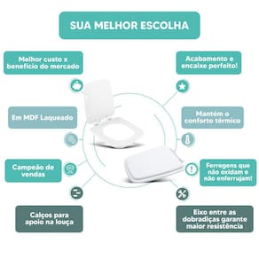 DIFERENCIAL * Possui calços que evitam o contato direto com a louça e que o assento deslize lateralmente. * Proporcionam maior estabilidade durante o uso. * Acabamento e encaixe perfeito no vaso sanitário. * Possui eixo entre as dobradiças, mantendo o assento sanitário firme na louça. * Sua ferragem metálica é super resistente e não oxida e nem enferruja.