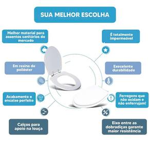 DIFERENCIAL * Possui calços que evitam o contato direto com a louça e que o assento deslize lateralmente. * Proporcionam maior estabilidade durante o uso. * Acabamento e encaixe perfeito no vaso sanitário. * Possui eixo entre as dobradiças, mantendo o assento sanitário firme na louça. * Sua ferragem metálica é super resistente e não oxida e nem enferruja.