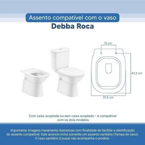 OBS.: O código 6LPF gravado na louça sanitária corresponde ao fluxo de água de uma descarga e não indica o modelo da mesma. RBN: Casa/Banho/Instalações e Acessórios de Banheiro/Vasos Sanitários e Peças/Assento de Vaso Sanitário | Conteúdo da Embalagem: 01 Assento Sanitário | Tipo: Assento Sanitário | Produto: Assento Sanitário | Site do Fabricante: www.ponttolavabo.com.br/ | Marca do Assento Sanitário: Pontto Lavabo | Garantia: 6 meses contra defeitos de fabricação | Dica: Instalação: sem desmontar o produto, posicione sobre o vaso sanitário e encaixe os dois parafusos com as borrachas pretas dentro do furo do vaso. Aperte com a chave de fenda no sentido horário até ficar firme. | Para Vaso Sanitário do Modelo: Debba | Para vaso Sanitário da Marca: Roca | Cor: Branco | Tonalidade: Branco | Material do Assento Sanitário: Poliéster | Instruções de Limpeza: Recomenda-se a limpeza com água e sabão neutro, não utilizar produtos abrasivos ou químicos | Almofadado?: Não | Peso do Produto: 2.98 | Tipo de Fechamento: Fechamento Comum | Material da Fixação: Alumínio Anodizado | Precisa de baterias ou pilhas: Não | Regulamentações aplicáveis a produtos perigosos: Não se aplica | Código de certificação: Não se aplica Ean: 7899983691120