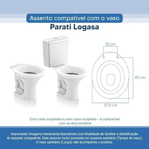OBS.: O código 6LPF gravado na louça sanitária corresponde ao fluxo de água de uma descarga e não indica o modelo da mesma. RBN: Casa/Banho/Instalações e Acessórios de Banheiro/Vasos Sanitários e Peças/Assento de Vaso Sanitário | Conteúdo da Embalagem: 01 Assento Sanitário | Tipo: Assento Sanitário | Produto: Assento Sanitário | Site do Fabricante: www.ponttolavabo.com.br/ | Marca do Assento Sanitário: Pontto Lavabo | Garantia: 6 meses contra defeitos de fabricação | Dica: Instalação: sem desmontar o produto, posicione sobre o vaso sanitário e encaixe os dois parafusos com as borrachas pretas dentro do furo do vaso. Aperte com a chave de fenda no sentido horário até ficar firme. | Para Vaso Sanitário do Modelo: Parati | Para vaso Sanitário da Marca: Logasa | Cor: Branco | Tonalidade: Branco | Material do Assento Sanitário: Poliéster | Instruções de Limpeza: Recomenda-se a limpeza com água e sabão neutro, não utilizar produtos abrasivos ou químicos | Almofadado?: Não | Peso do Produto: 2.98 | Tipo de Fechamento: Fechamento Comum | Material da Fixação: Alumínio Anodizado | Precisa de baterias ou pilhas: Não | Regulamentações aplicáveis a produtos perigosos: Não se aplica | Código de certificação: Não se aplica Ean: 7899983691533