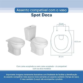 OBS.: O código 6LPF gravado na louça sanitária corresponde ao fluxo de água de uma descarga e não indica o modelo da mesma. RBN: Casa/Banho/Instalações e Acessórios de Banheiro/Vasos Sanitários e Peças/Assento de Vaso Sanitário | Conteúdo da Embalagem: 01 Assento Sanitário | Tipo: Assento Sanitário | Produto: Assento Sanitário | Site do Fabricante: www.ponttolavabo.com.br/ | Marca do Assento Sanitário: Pontto Lavabo | Garantia: 6 meses contra defeitos de fabricação | Dica: Instalação: sem desmontar o produto, posicione sobre o vaso sanitário e encaixe os dois parafusos com as borrachas pretas dentro do furo do vaso. Aperte com a chave de fenda no sentido horário até ficar firme. | Para Vaso Sanitário do Modelo: Spot | Para vaso Sanitário da Marca: Deca | Cor: Branco | Tonalidade: Branco | Material do Assento Sanitário: Poliéster | Instruções de Limpeza: Recomenda-se a limpeza com água e sabão neutro, não utilizar produtos abrasivos ou químicos | Almofadado?: Não | Peso do Produto: 2.98 | Tipo de Fechamento: Fechamento Comum | Material da Fixação: Alumínio Anodizado | Precisa de baterias ou pilhas: Não | Regulamentações aplicáveis a produtos perigosos: Não se aplica | Código de certificação: Não se aplica Ean: 7899983691663