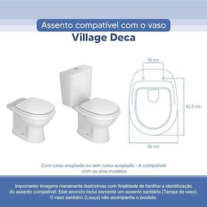 OBS.: O código 6LPF gravado na louça sanitária corresponde ao fluxo de água de uma descarga e não indica o modelo da mesma. RBN: Casa/Banho/Instalações e Acessórios de Banheiro/Vasos Sanitários e Peças/Assento de Vaso Sanitário | Conteúdo da Embalagem: 01 Assento Sanitário | Tipo: Assento Sanitário | Produto: Assento Sanitário | Site do Fabricante: | Marca do Assento Sanitário: Pontto Lavabo | : 6 meses contra defeitos de fabricação | Dica: Instalação: sem desmontar o produto, posicione sobre o vaso sanitário e encaixe os dois parafusos com as borrachas pretas dentro do furo do vaso. Aperte com a chave de fenda no sentido horário até ficar firme. | Para Vaso Sanitário do Modelo: Village | Para vaso Sanitário da Marca: Deca | Cor: Branco | Tonalidade: Branco | Material do Assento Sanitário: Poliéster | Instruções de Limpeza: Recomenda-se a limpeza com água e sabão neutro, não utilizar produtos abrasivos ou químicos | Almofadado?: Não | Peso do Produto: | Tipo de Fechamento: Fechamento Comum | Material da Fixação: Alumínio Anodizado | Precisa de baterias ou pilhas: Não | Regulamentações aplicáveis a produtos perigosos: Não aplicável | Código de certificação: Não aplicável | Ponto de Destaque01: Produzido em 100% Resina de Poliéster, impermeável | Ponto de Destaque02: Ferragem em Alumínio Anodizado (não enferruja, não oxida) | Ponto de Destaque03: Possui 15cm de distância entre furos | Ponto de Destaque04: Produto vai completo, fácil instalação | Ponto de Destaque05: Pontto Lavabo | Termos de Pesquisa01: Assento Sanitário; Tampa de Vaso Sanitário; Village Branco Deca; Village 6lpf; Deca 6lpf | Quantidade de itens: 1 | Fonte de energia: Não aplicável | Dimensões da embalagem: Altura: 5cm x Largura: 40cm x Comprimento: 50cm | de caixas: 1