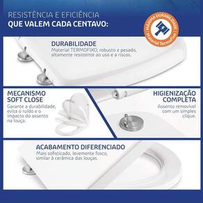 A linha de Assentos Sanitários Tigre Smart Termofixo, desenvolvida em Resina termofixa, material robusto e pesado, altamente resistente ao impacto, riscos e altas temperaturas, traz silêncio e suavidade de paraquedas ao seu banheiro. Abre e fecha com total higiene, combina com tudo e com um simples clic você remove totalmente o assento,facilitando a limpeza. Os assentos sanitários têm como função ser uma tampa para o vaso sanitário, e também de evitar o contato direto com a louça, garantindo ao usuário conforto e higiene no uso.O Assento Sanitário Tigre Smart Soft Close tem um design sofisticado com textura levemente fosca, similar à cerâmica da louça e a durabilidade para ficar por muitos anos na sua casa. O sistema chamado Soft Close tem como função proporcionar um fechamento da tampa e do assento com suavidade, evitando danos ao produto e ao usuário.Quer mais modernidade e conforto no banheiro Vai de TigreVANTAGENS- Durabilidade: Material termofixo, robusto e pesado, é altamente resistente ao uso e a riscos.- Fechamento Suave: O mecanismo Soft Close garante o fechamento suave da tampa, evita o ruído e o impacto do assento na louça.- Facilidade na Limpeza: O assento é removível com um simples clique, pode ser lavado no tanque, o que garante a higienização completa.- Acabamento Diferenciado: Sofisticado e levemente fosco, similar à cerâmica das louças sanitárias.- Garantia Tigre: o seu assento tem garantia de 01 ano.- Fixação em Inox: Oferece um aspecto mais sofisticado e estético ao assento sanitário, proporcionando resistência à umidade e resíduos de produtos de limpeza. INFORMAÇÕES GERAIS- Referência: 300000593.- Linha: Oval/Universal.- Compatível com: Deca Izy/Ravena , Celite Azaleia/Saveiro/Eco , Incepa Flamingo/Zip , Roca Victoria e Icasa Diamantina - Cor: Preto.RECOMENDAÇÕES DE USO-evitar o contato com ácido muriático ou qualquer outro solvente que possa vir a agredir o produto.Imagens meramente ilustrativas. Demais itens da ambientação não acompanham o produto.