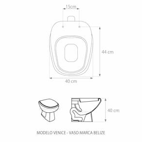 Especificações Técnicas: - Dimensões da caixa: largura: 50,00cm, altura: 4,00cm, comprimento: 40,00cm - Acabamento: brilhante - Uso: adequado para uso na louça Belize modelo Venice - Garantia: 3 meses - Itens inclusos: tampa e assento, parafusos e embalagem duplamente reforçada