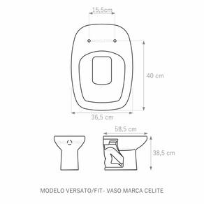 Assento Sanitário (tampa de vaso) fabricado em polipropileno. Resistente, durável, com excelente acabamento e design sofisticado. Devido a sua composição este produto é totalmente impermeável e de fácil limpeza e higienização. Compatível com vasos sanitários de descarga convencional e também vasos com caixa acoplada. Acabamento brilhante no tampo e no assento. Fixação regulável para o perfeito encaixe na louça sanitária. Fácil limpeza, é higiênico e não acumula sujeira. O assento é acompanhado por parafusos para instalação e acabamentos. Embalagem dupla reforçada garante o recebimento do produto totalmente protegido. Especificações: - Dimensões da caixa: largura: 50,00cm. Altura: 4,00cm comprimento: 40,00cm - Acabamento: brilhante - Uso: este assento é adequado para uso na louça Celite modelo Versato - Garantia: 3 meses - Itens inclusos: Tampa e assento, parafusos, acabamentos e embalagem duplamente reforçada. Instalação: posicione o produto, devidamente centralizado, em cima do vaso sanitário. Encaixe os parafusos e encaixe as porcas. Aperte até que o assento esteja firme no vaso. Manutenção: recomendamos a limpeza periódica com pano levemente umedecido com sabão neutro. Não usar esponjas abrasivas ou palha de aço nem qualquer tipo de produto químico.