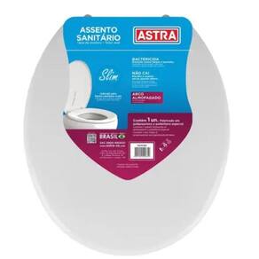 Assento vaso sanitário slim almofadado universal oval astra Descrição: Compatível com os vasos sanitários ovais. O assento almofado slim da astra é mais um modelo que compõe a linha de assentos mais confortáveis do brasil. Com arco almofadado macio, a versão possui formato oval. ========== Caracteristicas: Arco almofadado. Fácil de limpar. Proteção contra fungos e bactérias. Fabricado com superfície lisa, que evita o acúmulo de sujeira. O produto passa por testes que comprovam maior resistência e durabilidade. ========== Recomendações e uso: Para manter seu assento com boa aparência, faça sua limpeza usando apenas uma esponja ou pano macio e sabão neutro. Não use saponáceos, álcool, esponja de aço, detergentes fortes ou produtos químicos agressivos. ========== Informações técnicas Formato: oval Material: pebd, pu, abs, pp e pom Acabamento: liso Superfície lisa: sim Modelo: almofadado Suporta até: 150 kg Tipo fechamento: convencional Proteção bactericida: sim Cor kit fixação: natural Material kit fixação: poliacetal e polipropileno : 90 dias Manual: sim Itens inclusos: arco, tampo e kit de fixação Tipo material: plástico Compatibilidade: oval Informações: ========== Indicado apenas para louças ovais. Fique atento às medidas e formato da sua louça sanitária para verificar a compatibilidade com os assentos da astra. Para manter a boa aparência do produto, limpe o assento com uma esponja ou pano macios e sabão neutro. Não use saponáceos, álcool, esponja de aço, detergentes fortes ou produtos químicos agressivos. As cores do produto podem sofrer variações de acordo com o monitor, a iluminação do ambiente ou a sua percepção visual. Fotos meramente ilustrativas. Os objetos que compõe a foto ambientada não acompanham o produto.