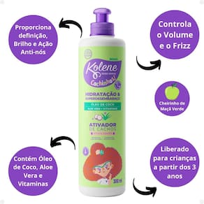 Sua fórmula é indicada para todos os tipos de cachinhos, conta com ativos suaves e o poder do Óleo de Coco, Aloe Vera e Vitaminas, que juntamente com os demais ingredientes da fórmula, proporcionam Superdefinição, Brilho, Ação Anti-nós e Controle de Volume e Frizz. Além disso, a linha é Hipoalergênica, Dermatologicamente testada, Aprovada por Pediatras, 100% Vegana e Liberada. Indicado para crianças a partir de 3 anos.