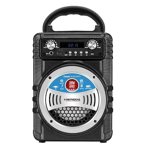 Caixa Amplificadora Multi Connect Thunder V da Mondial. Este modelo é ideal para você que aprecia som de qualidade. Suas festas e reuniões com amigos e família nunca mais serão as mesmas. Ela reproduz MP3 em dispositivos USB/Cartão SD, tem entrada Auxiliar Plus (P2), entradas para microfone plug (P10), alça para transporte e flash lights coloridos que pulsam com a música para deixar o ambiente mais descolado ainda. A bateria interna é recarregável, são 30W RMS de potência, com display digital, conexão bluetooth, além de ser compatível com guitarra, violão, computador, notebook, aparelho televisor, aparelho MP3/MP4 e celular.