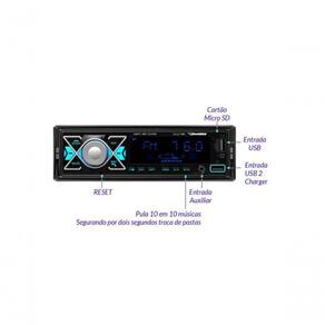 A conectividade é um dos grandes destaques do RS-2714BR Plus. Além de contar com conexão Bluetooth para você reproduzir músicas diretamente do seu smartphone, o auto rádio também possui entrada auxiliar frontal, entrada para cartão micro SD e duas entradas USB dedicadas: uma para recarregar dispositivos e outra para reproduzir arquivos de áudio a partir de um pen drive. Essa combinação de opções permite que você escolha a melhor forma de aproveitar suas músicas e podcasts, sem complicações.