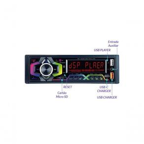 Descricao Auto Radio AM/FM RS-150BR DSP Pro LineModernidadeO Auto Radio RS-150BR DSP Pro Line foi desenvolvido com o que ha de melhor em tecnologia para auto radios, ele possui um processador DSP integrado que eleva a qualidade sonora e possibilita uma melhor regulagem de equalizacao em 40 bandas de frequencia. Voce tambem podera as saidas de Low Pass e High Pass, SubWoofer e 3D surround.ConectividadeO auto radio RS-150BR DSP Pro Line possui entrada auxiliar frontal, entrada para cartao micro SD, entrada para USB ate 128GB, conexao Bluetooth 5.0, entrada de microfone externo, conexao com comando de volante, entrada USB e USB-C para recarregar celuar, tablet ou ate mesmo computadores com recarga via USB-C. Alem disso possui saidas RCA em 4V o que eleva a qualidade de saida de audio e mais duas saidas de Sub Woofer.Controle total em suas maosVoce pode controlar o auto radio atraves do controle remoto que acompanha o aparelho*.Alem disso, este modelo de auto radio pode ser amplamente controlado tambem por aplicativo (via Bluetooth) atraves do programa AUTO DSP disponivel na APP STORE e no GOOGLE PLAY. Aceita controle de longa distancia.*Imagens meramente ilustrativas.Especificacao Tecnica Painel: Fixo com botoes em RGBVisor: LCD em RGBRadio: AM/FM (76~108Mhz) com memoria para 18 estacoes FM e 12 AMProcessador: DSPControles: HPF/LPF, Sub Grave, Graves, Agudos e Balanco dos CanaisEqualizador: Divisao de 40 bandas de frequnciaConexoes: Bluetooth 5.0Entradas: Micro SD (128 Gb), Auxiliar, 2 USBs (1 Charger e 1 Player) e 1 USB-C (Charger)Saidas:4 RCA 4V (audio) e 2 RCA (SUB)Tipo de Conector:ISOControle Remoto: SIM (Fisico e por aplicativo DSP)Potencia:4 Canais de 60 Watts RMS*Possui conexao com o comando de volanteConteudo da embalagem:01 Auto Radio RS-150BR DSP Plus01 Controle Remoto01 Chicote alimentacao (ISO Conector)01 Chicote de audio (ISO Conector)Manual e Certificado de Garantia