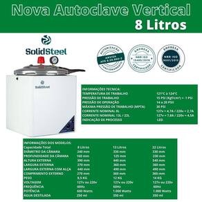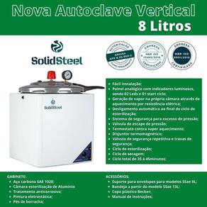 Autoclave 8 litros solid steel modelo easy com anvisa - para manicure/ podologia/ odontologia/ instrumental cirúrgico e entre outros - 110v Descrição: A autoclave vertical easy de 8l tem dois grandes diferenciais: possui registro na anvisa e foi desenvolvida sob rigorosos testes de qualidade e segurança. O processo de esterilização ocorre pela ação de alta temperatura e pressão, eliminando a vida microbiana dos utensílios colocados dentro da autoclave, impedindo assim a contaminação pela utilização dos mesmos. O modelo easy é um modelo econômico, de simples operação, com desligamento automático e termostato contra super aquecimento, além de válvulas e trava de segurança. Isso faz com que o mesmo atenda as exigências da anvisa para uma correta esterilização do seu material, entre 121 e 124 ºc chegando até 30 psi interna. Características: - fácil instalação. - autoclave vertical para esterilização e secagem de utensílios. - gabinete externo fabricado em chapa de aço carbono sae 1020 com tratamento químico anticorrosivo e pintura epóxi eletrostática a pó para maior durabilidade. - frestas na parte traseira do gabinete para evitar super aquecimento. - câmara de esterilização em alumínio. - painel analógico com indicadores luminosos, sendo 02 leds, 01 start ciclo; - pés de borracha. - geração de vapor na própria câmara através de aquecimento por resistência elétrica. - resistência tubular em aço inox aisi 304. - desligamento automático ao final do ciclo de esterilização. - porta com travas de segurança. - sistema de segurança para excesso através de válvulas repetitivas - válvula de escape - termostato contra super aquecimento em caso de falta de água - disjuntor termomagnético - isolação térmica em todas as laterais e fundo da câmara. - ciclo de esterilização: +/- 35 a 45 minutos - ciclo de secagem: +/- 5 minutos - capacidade: 8 litros - alimentação: 110 ou 220v, 60 hz, potência de 600 watts - temperatura de trabalho: 121ºc a 124ºc - manômetro para indicação da temperatura e pressão - pressão de trabalho: 15 psi kgf/cm +/- 1psi - pressão de operação: 14 a 20 psii - máxima pressão de trabalho mpta : 30 psi - corrente nominal 8l: 127v = 4,7a Informação dos modelos: - diâmetro da câmara: 240mm - profundidade da câmara: 160mm - altura externa: 390mm - largura externa: 270mm - largura externa com alça: 440mm - comprimento externo: 270mm - peso: 8,5kg - voltagem: 110v ou 220v - frequência: 60hz - potencia: 600 watts - água destilada: 250ml Manual de instruções em português 1 cabo de energia elétrica com plug de três pinos, duas fases e um terra nbr 14136 Termo de 1 ano contra defeitos de fabricação. Marca: Não Informado