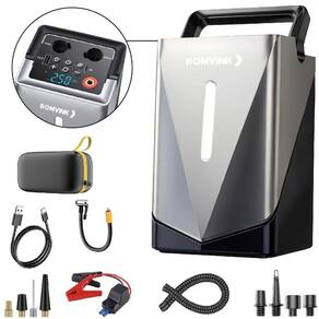 O Auxiliar de partida portátil a bateria com compressor integrado e acessórios BOM-8910 da Bomvink, o seu novo companheiro essencial para emergências automotivas. Compacto, confiável e incrivelmente versátil, este auxiliar de partida portátil não é apenas uma fonte de energia, mas também um compressor de ar com funcionalidades adicionais que tornam qualquer situação de emergência mais gerenciável. Auxiliar de Partida Eficiente: Não fique nunca mais parado devido a uma bateria de carro descarregada. Com uma potente capacidade de partida, o BOM-8910 garante que o seu veículo arranque com facilidade em qualquer clima ou situação. Compressor Integrado de Alta Pressão: O compressor embutido alcança uma pressão máxima de 150 PSI, ideal para pneus de carros, bicicletas e até equipamentos esportivos. Múltiplas Funções de Carregamento: Equipado com uma entrada Tipo-C e saída USB-A, permite o carregamento rápido de diversos dispositivos eletrônicos, garantindo que você mantenha seus gadgets carregados em situações de emergência. Iluminação LED Integrada: Com um valor de lumen de 20LM, a iluminação LED é perfeita para operações noturnas ou em ambientes com pouca luz, oferecendo visibilidade sem igual. Display LCD Conveniente: Monitorize facilmente os níveis e bateria com um display claro e legível, que torna o uso do BOM-8910 extremamente user-friendly. A durabilidade encontra a funcionalidade no BOM-8910 da Bomvink. Com uma estrutura fortalecida e uma capacidade de 2000mAh, este dispositivo é o auxiliar de partida que garantirá que você e seu veículo estejam sempre prontos para seguir viagem. - Acessórios Inclusos Bico de ar Multifuncional 4 unidades Cabo de Carregamento USB-C Mangueira para Inflar Bico Para Ventilação da Função Soprador 4 unidades Mangueira Clipe de Bateria Inteligente Bolsa. Marca: Não Informado