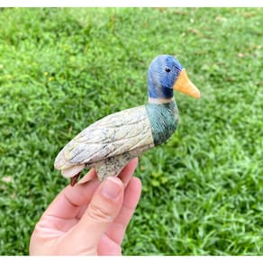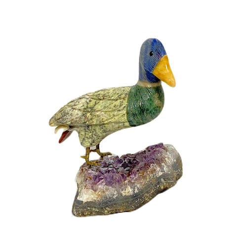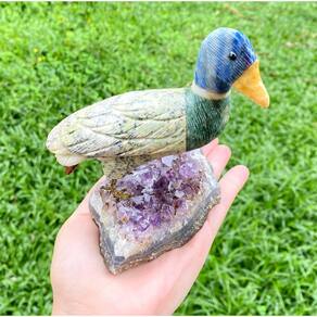 Amostra de Ave esculpida artesanalmente em pedra semipreciosa natural (minerais variados).