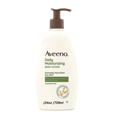 Aveeno Daily Moisturizing 709ml Hidratação Corporal 24 Horas A Loção Corporal Hidratante Diária Aveeno com fórmula de Aveia Prebiótica nutre intensamente a pele seca. Formulada com aveia prebiótica , a loção sem fragrância tem hidratação clinicamente comprovada que dura 24 horas. Esta loção corporal diária nutre e ajuda a repor a barreira natural de hidratação da pele. A fórmula única de aveia prebiótica é rapidamente absorvida e nutre a pele seca com hidratação, deixando a pele macia, bonita e com aparência saudável. A fórmula suave da Loção Hidratante Diária Aveeno não contém fragrâncias, parabenos ou corantes. Testada contra alergias e não é oleosa, não comedogênica e é suave o suficiente para uso diário como parte de uma rotina regular de cuidados com a pele e beleza. Para usar, aplique diariamente quantas vezes for necessário. Aveeno Loção Corporal Hidratante Diária com aveia prebiótica nutre intensamente a pele seca Loção suave, adequada para peles sensíveis, possui hidratação clinicamente comprovada que dura 24 horas. A loção corporal hidratante nutre e ajuda a repor a barreira natural de hidratação da pele Apresentando uma fórmula de rápida absorção que deixa sua pele macia, bonita e com aparência saudável Garrafa feita com 30% de plástico reciclável.