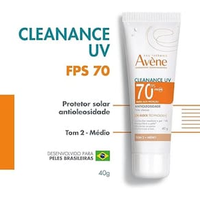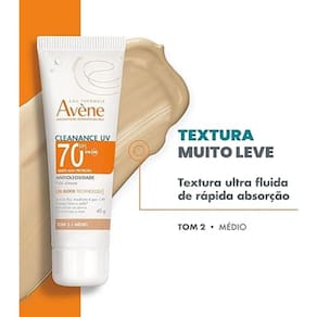 Cleanance UV FPS70 Tom 2 - Médio é um protetor solar de muito alta proteção contra os raios UVB e UVA curtos e longos que possui uma tecnologia oil-block para o cuidado completo que reequilibra a pele e controla a oleosidade de maneira prolongada. Uniformiza o tom da pele, com uma cobertura natural e textura ultra fluida. Com uma combinação exclusiva de ativos no controle da oleosidade: monolaurina, p-refinyl e gluconato de zinco, garante: - 14h antioleosidade e absorção imediata; - Textura fluida e leve; - Diminui a aparência dos poros dilatados; - Mantém a aparência da pele mais uniforme; - Cobertura leve e natural Muito além de um protetor solar, reduz -43% da oleosidade da pele em 28 dias. O aliado perfeito no cuidado da pele oleosa. Disponível em 3 tons desenvolvidos especialmente para peles brasileiras que promovem uma cobertura leve e uniformiza o tom da pele. Com Água Termal Avène, esse produto é hipoalergênico e não comedogênico e foi formulado de maneira a minimizar o possível surgimento de alergia. Associação exclusiva SUNSITIVE PROTECTION: sistema de filtros patenteados, com fórmula biodragradável que não agride os corais, plânctons e zooplânctons.