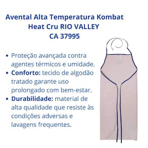 Avental Alta Temperatura Kombat Heat Cru RIO VALLEY CA 37995 Proteção, Segurança e Durabilidade para Profissionais O Avental Alta Temperatura Kombat Heat Cru foi desenvolvido para proteger o tronco do usuário contra agentes térmicos, incluindo pequenas chamas, calor de contato, convectivo e radiante, além de oferecer proteção contra umidade proveniente de operações com uso de água. Esta peça de proteção é ideal para ambientes industriais de alto risco térmico.