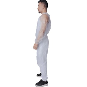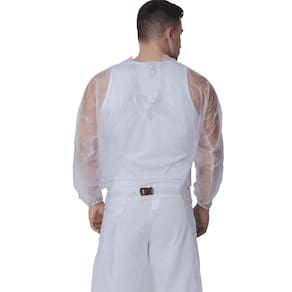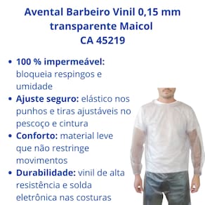 Avental Barbeiro Vinil 0,15 mm Maicol CA 45219 Proteção e praticidade em corte e higienização O avental barbeiro em vinil laminado de 0,15 mm foi desenvolvido para oferecer barreira impermeável contra respingos de líquidos e produtos químicos em baixas concentrações, mantendo conforto e mobilidade durante o uso prolongado. Conta com mangas longas, elástico nos punhos, fechamento por botões de pressão nos ombros e tiras soldadas na cintura com fivela de engate rápido.