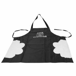 - Qual é a cor predominante do avental? A cor predominante do avental é preto, com estampa.