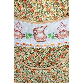 Avental fabricado em tecido estampado matelado, com estampa floral nas cores branco e laranja, detalhes em leise e passa fitas no bolso com uma faixa bordada em ponto cruz de jarro e panelas em tons de laranja e verde, acabamento em viés na cor laranja.