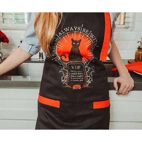 - ENCANTE SUA BRUXA INTERIOR: O avental de cozinha apresenta Thackery Binx, o gato preto, no topo da lápide de Emily, cercado pela citação icônica “Eu sempre estarei com você”. O design preto escuro é compensado com detalhes vibrantes em laranja.