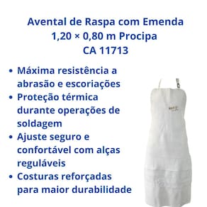 Avental de Raspa com Emenda 1,20 × 0,80 m Procipa CA 11713 Proteção robusta para soldagem e processos pesados O avental Procipa é confeccionado em couro raspa resistente, com emenda reforçada e costuras duplas. Possui alças de raspa no pescoço e cintura, ajustáveis por fivela plástica, garantindo cobertura eficaz do tronco contra respingos de solda, faíscas, agentes abrasivos, escoriantes e calor.