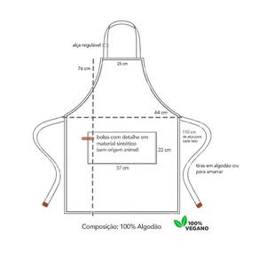 Avental corpo inteiro com tiras de algodao e faixa de cabelo. Avental com alça regulavel no pescoço e ajustavel na cintura com bolso frontal. Ideal para chef de cozinha, barista, jardinagem, pintura e outros. Este avental atende bem aos clientes mais exigentes priorizando conforto, qualidade e estilo. Os detalhes são em material sintético, sem origem animal.